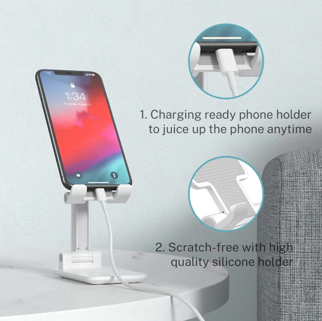 • Non-slip & Stable: This desktop cell phone stand equipped with a heavier base and an aluminum alloy rod, which has strong bearing capacity, it's stable enough to support your mobile phone or even, the contact surface between the device and the bracket is designed with silicone anti-skid pad, it is maximum protect your device from scratches and sliding.
